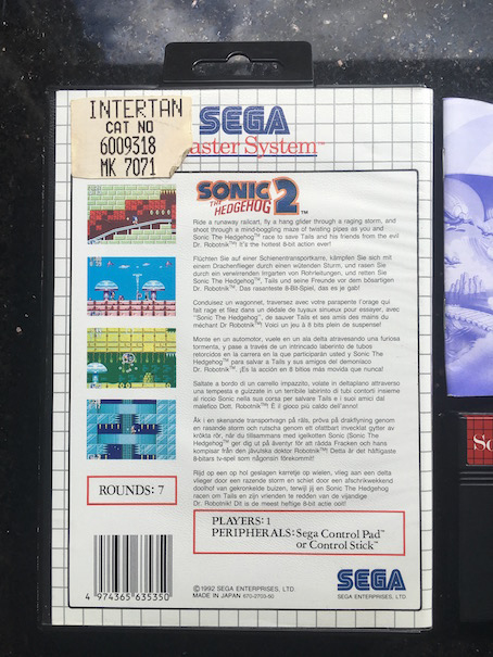 Sonic the Hedgehog 2 is an 8-bit side-scrolling platform video game developed by Aspect and released by Sega for their Master System and Game Gear formats. The Master System version was released in Europe on October 16, 1992, and in Brazil around the same time. The Game Gear version was released in Europe on October 29, 1992, North America on November 17, 1992 and in Japan on November 21, 1992.