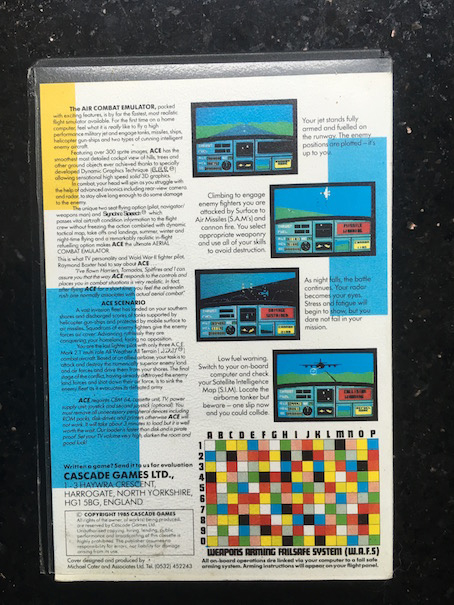 Ace (stylized as ACE as acronym for Air Combat Emulator) is a flight simulator video game developed by Cascade Games for various home computers released in 1985. In-game, the player takes the role a fighter jet pilot defending an English coastland against an enemy invasion, having to fight off aerial, ground and naval forces while Allied bases evacuate. The display shows the plane's instrumentation and cockpit view.